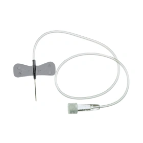 Igła ze szlifem łyżeczkowym przeznaczona do długotrwałych wlewów oraz płukania portu. Posiada skrzydełka i dren. Nasadka koloru żółtego.