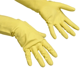 Grube, gospodarcze rękawice z naturalnego lateksu z bawełnianą wyściółką. Zapewniają komfort, dobrą chwytność i ochronę dłoni przy pracach z rozcieńczonymi detergentami.