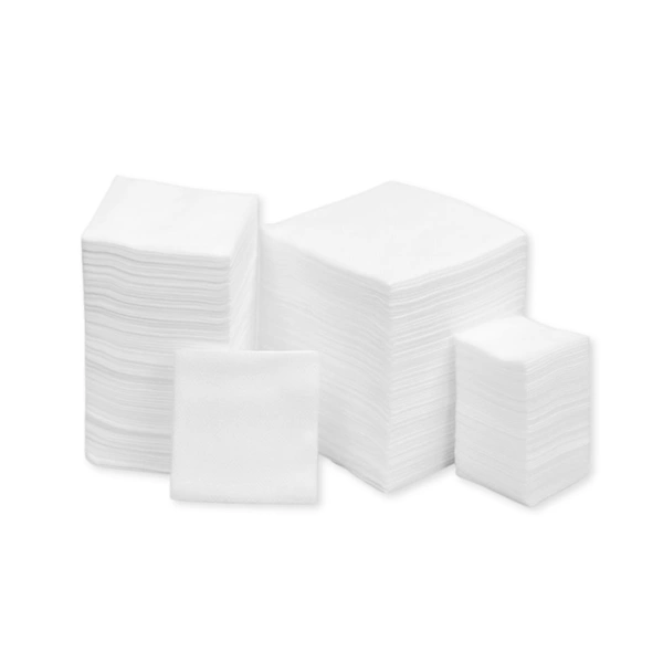 Niejałowe kompresy z hydrofilowej gazy bawełniane. Bielone metodą bezchlorową, odpowiednie do opatrywania różnego rodzaju ran.