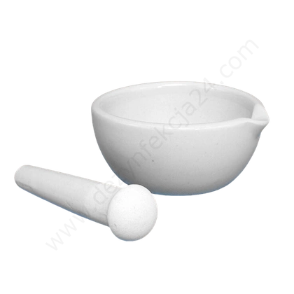 Duży moździerz porcelanowy z wylewem. Ma chropowate wnętrze i końcówką tłuczka ułatwiające mieszanie.