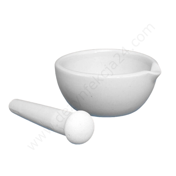Duży moździerz porcelanowy z wylewem. Ma chropowate wnętrze i końcówką tłuczka ułatwiające mieszanie.