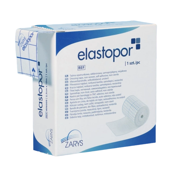 Opakowanie plastra Elastopor jest jednocześnie dyspenserem, który ułatwia rozwijanie plastra bez konieczności wyciągania go z pudełka. Cecha ta zmniejsza ryzyko kontaminacji przylepca.