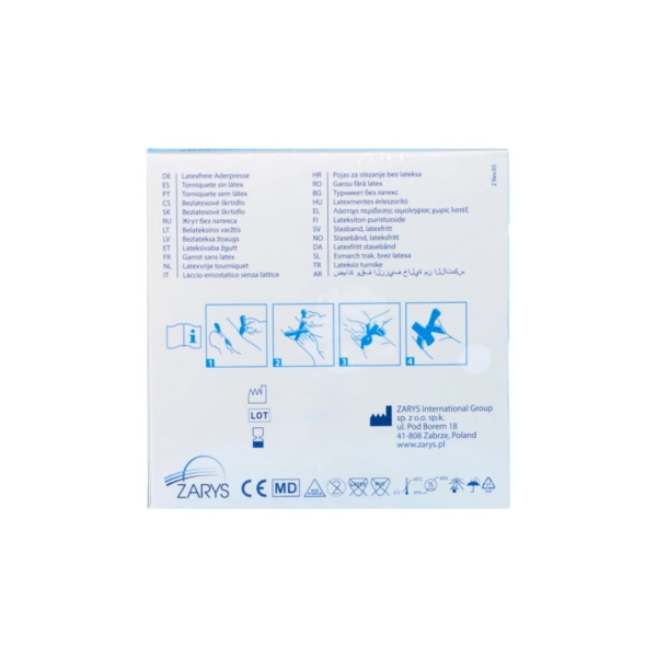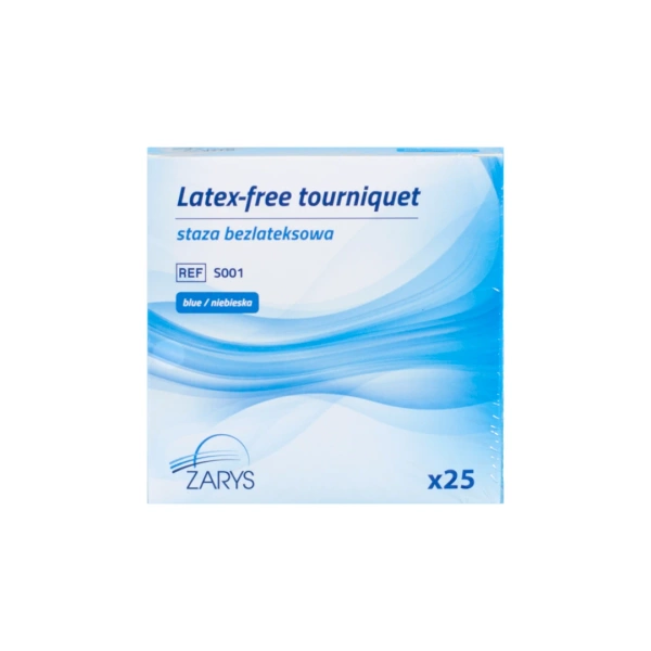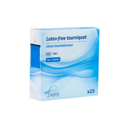 - Bezlateksowa staza uciskowa. W opakowaniu znajduje się 25 zrywanych kawałków stazy.