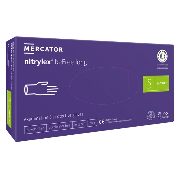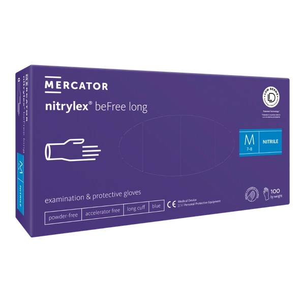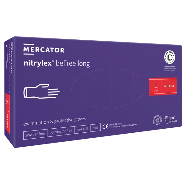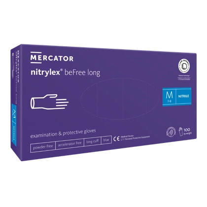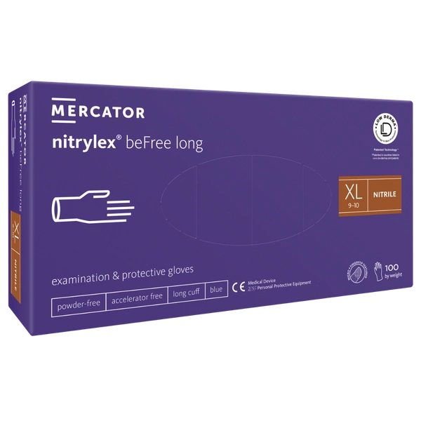 Nitrylex beFree DŁUGIE są to syntetyczne, nitrylowe bezpudrowe rękawice z przedłużonym mankietem.