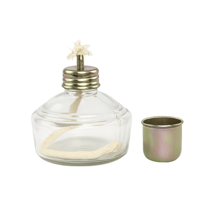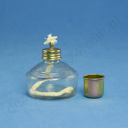 W szklanym pojemniku umieszcza się denaturat lub alkohol o wysokim stężeniu, który nasącza knot.
