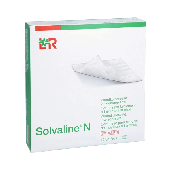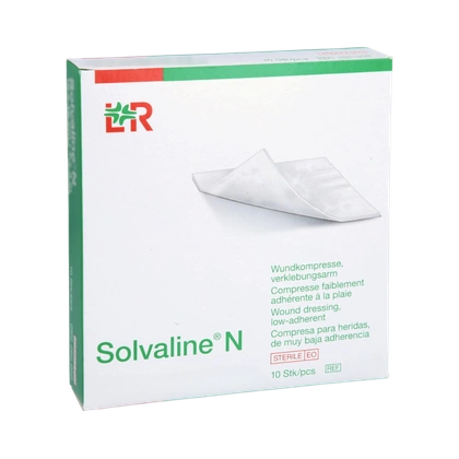 Solvaline N to opatrunek bawełniany obustronnie pokryty perforowaną folią poliestrową. Praktycznie pozbawiony tendencji do przywierania do rany, co umożliwia jego atraumatyczną zmianę. Opatrunek Solvaline N można przycinać i można stosować obustronnie.
