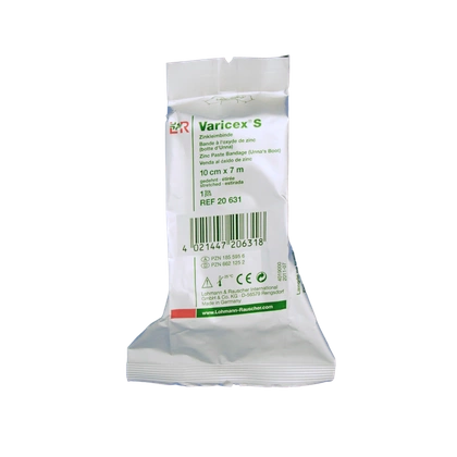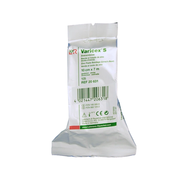 Varicex S to opaska dziana, elastyczna, rozciągana zarówna wzdłuż, jak i wszerz; z pastą cynkową.