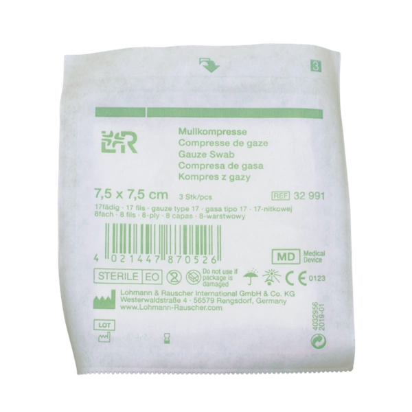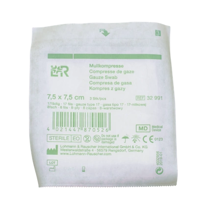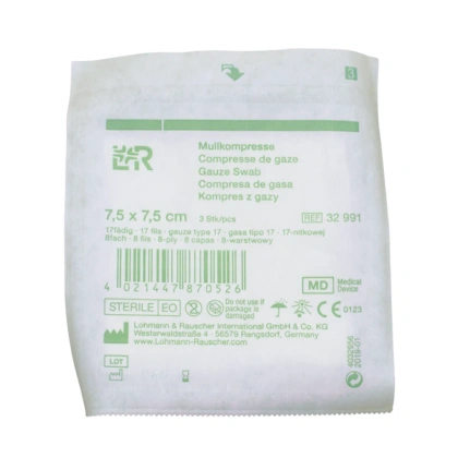 Kompresy gazowe 17. nitkowe 8. warst. 7,5 x 7,5 cm. (3 szt.) sterylne - L&R