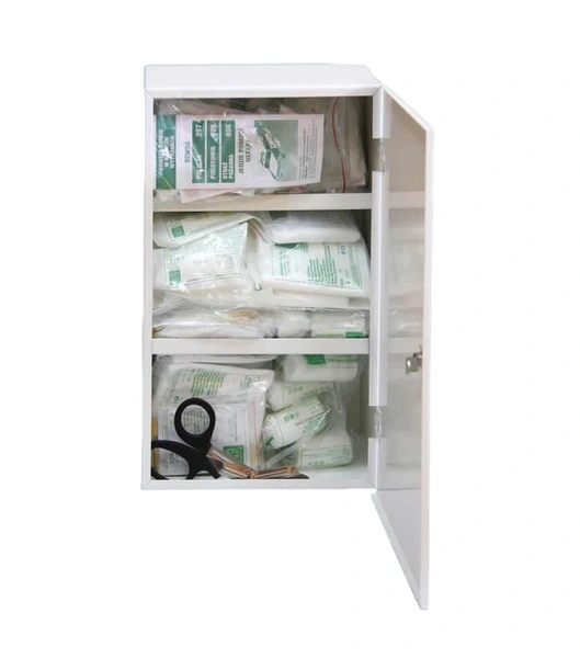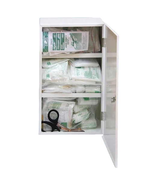 Apteczka ścienna, stalowa "50" MIX: DIN 13164 + 13157 + aparat do sztucznego oddychania