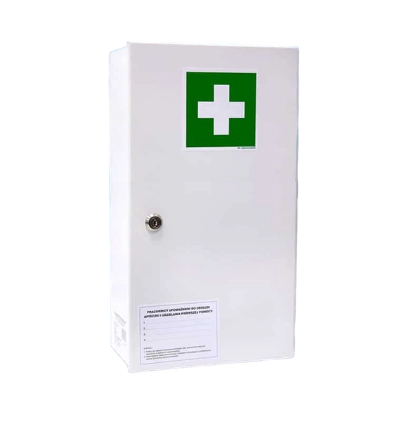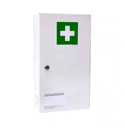 Stalowa apteczka ścienna, malowana białą farbą proszkową.