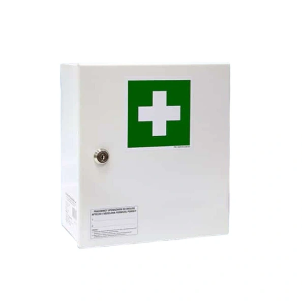 Stalowa apteczka ścienna, malowana białą farbą proszkową.