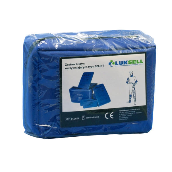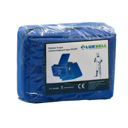 Komplet 4 szyn stabilizujących zwichnięte lub złamane kończyny. Służą do szynowania złamań, zwichnięć i urazów. Możliwość użycia jako kołnierze, do unieruchomienia głowy, jak i do unieruchomienia kończyny na czas podłączenia kroplówki.