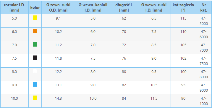 - przeznaczona do przywrócenia prawidłowej drożności dróg oddechowych. Stosowana u jednego pacjenta jednorazowo lub w sposób ciągły. Długość 82 mm