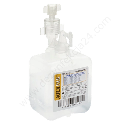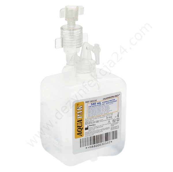 Wstępnie napełnione nawilżacze Aquapak firmy Hudson składają się z łatwego w użyciu adaptera oraz jednego pojemnika z wodą sterylną o pojemności 340 ml.