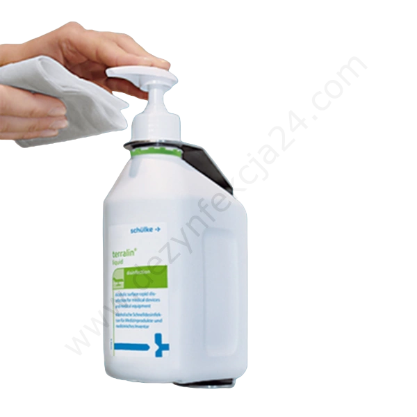 Uchwyt ścienny przeznaczony na butelki z płynami o pojemności 500 ml. Prosta konstrukcja pozwala na łatwy montaż uchwytu w dogodnym miejscu.