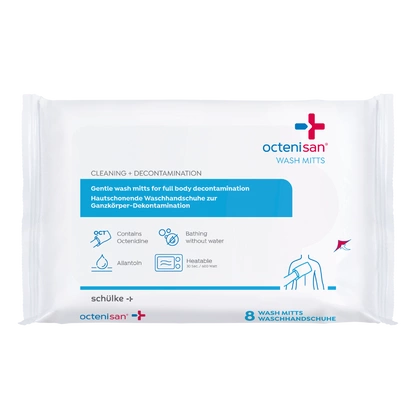 - Rękawiczki nasączone antybakteryjną emulsją Octenisan przeznaczone do mycia ciała.