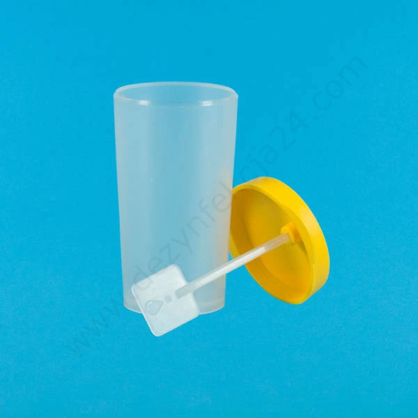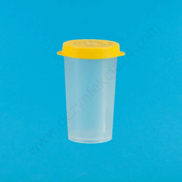 - Pojemnik jednorazowy do kału przezroczysty z nakrętką i łopatką.