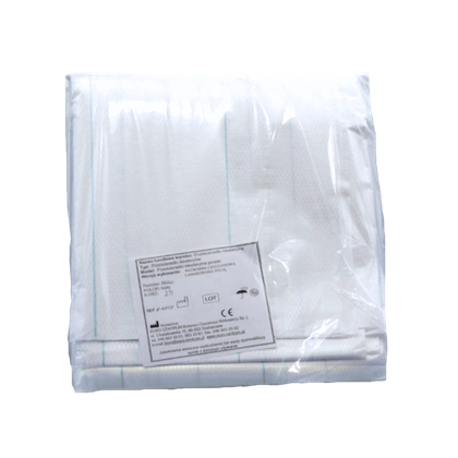 • Jednorazowe prześcieradło wykonane z nieprzemakalnej struktury laminatu celulozowego, wzmancniane niebieskimi paskami.