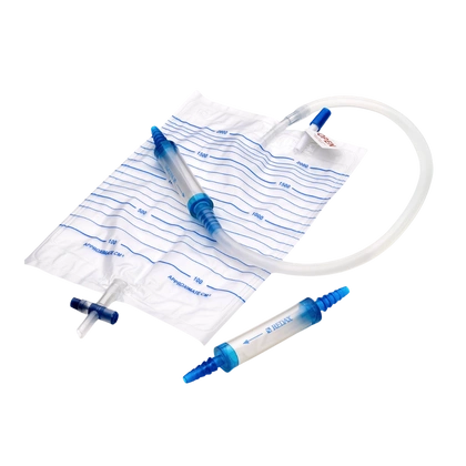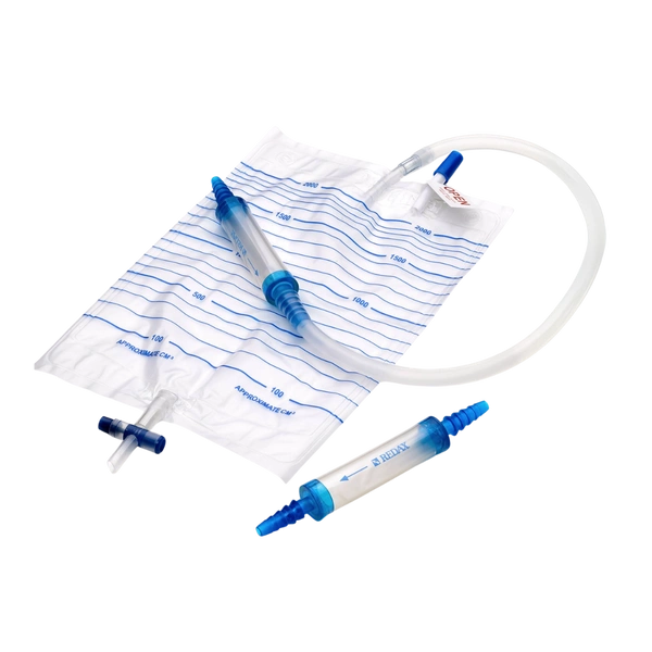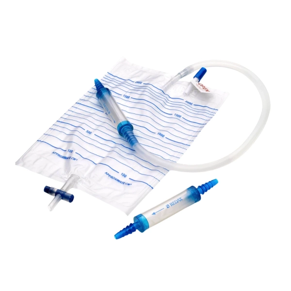 Zakończona obustronnie łącznikiem schodkowym, który łączy ją z workiem oraz drenem pacjenta.
