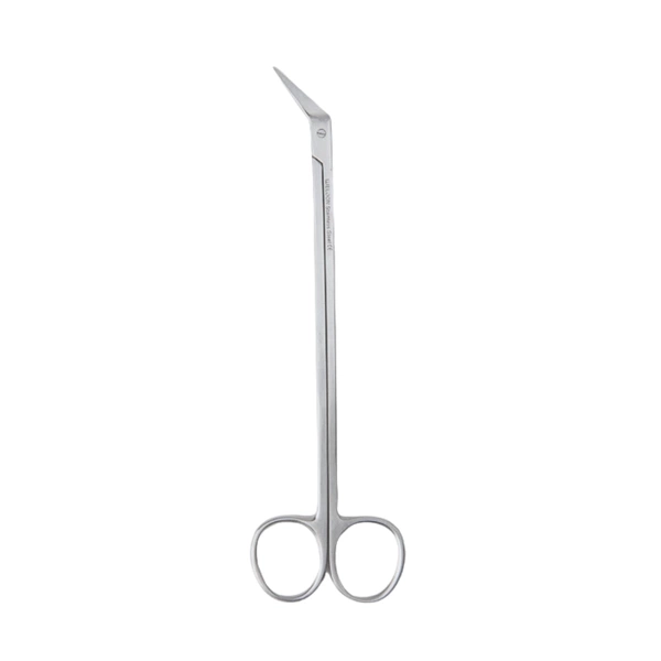 - precyzyjne nożyce naczyniowe ze spiczastymi, kątowymi końcówkami. Do preparowania i cięcia tkanek. Wielokrotnego użytku, ze stali nierdzewnej.