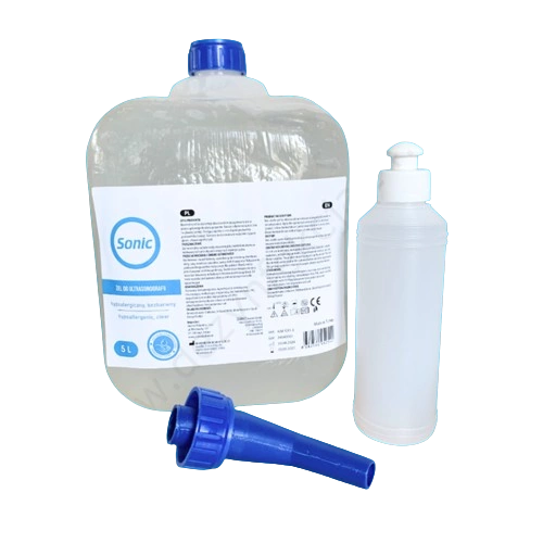 - Bezbarwny żel transmisyjny do USG 5000 ml do diagnostyki USG i Doppler. Zawiera dodatkowy lejek oraz butelkę 250 ml.
