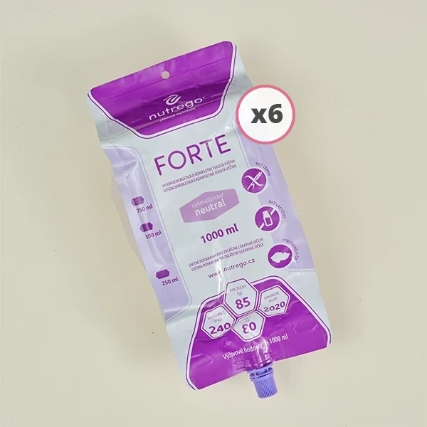Nutrego FORTE 1000 ml, zawiera 2000 kcal, jest to kompletna pod względem odżywczym hiperkaloryczna i wysokobiałkowa dieta do żywienia dojelitowego. Zawiera niezbędną dobową porcję wszystkich składników odżywczych, w tym witamin i mikroelementów. Do postępowania dietetycznego u pacjentów niedożywionych lub zagrożonych niedożywieniem związanym z chorobą.