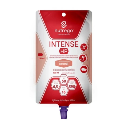 Nutrego INTENSE HP to kompletna pod względem odżywczym dieta izokaloryczna z wysoką zawartością białka (wysokiej jakości białka serwatki) i rozpuszczalnego błonnika. Przeznaczona jest dla pacjentów we wszystkich fazach choroby krytycznej i rekonwalescencji, potrzebujących dużej dawki białka i zmniejszonej ilości energii. Nadaje się również dla pacjentów otyłych, m.in. otyłość sarkopeniczna i z cukrzycą. Poprawia trawienie i wchłanianie, zapewnia wysoki udział tłuszczów MCT oraz niska osmolarność. Nutrego INTENSE HP  wspomaga funkcję ochronną bariery jelitowej dzięki dodatkowi błonnika (inuliny). Nie zawiera glutenu i laktozy.