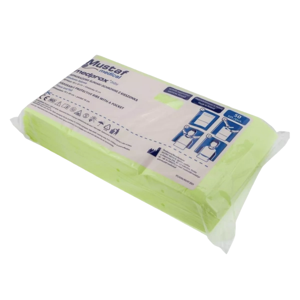 • Jednorazowe śliniaki dentystyczne Medprox Bibs z dużą praktyczną kieszenią. Wymiary: 36 x 49 cm