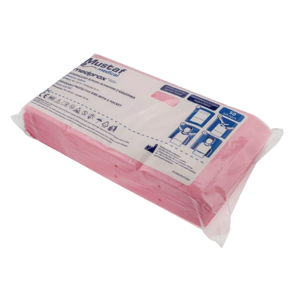 - Jednorazowe śliniaki dentystyczne Medprox Bibs z dużą praktyczną kieszenią. Wymiary: 36 x 49 cm