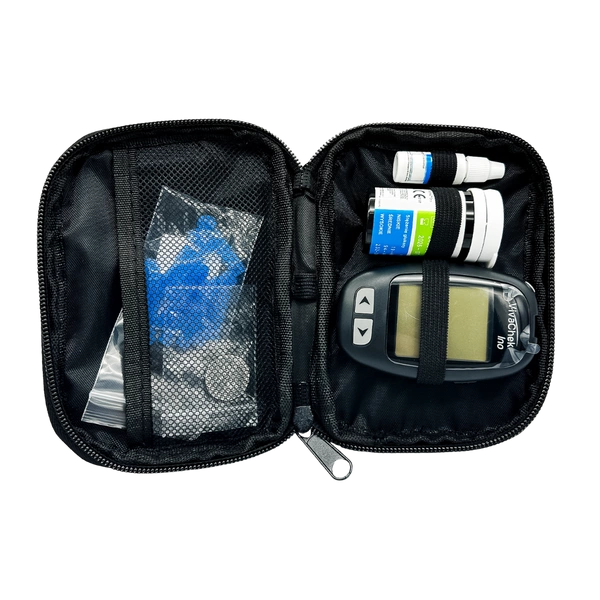 Zestaw startowy do monitorowania stężenia glukozy we krwi u osób z cukrzycą. Zawiera wszystkie niezbędne elementy do rozpoczęcia regularnej kontroli.