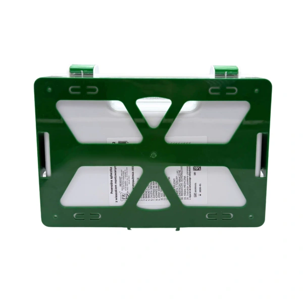 Apteczka z montażem do uchwytu (ściennego lub na innych powierzchniach). Konstrukcja pozwala na szybkie wypięcie całej apteczki z uchwytu i zaniesienie na miejsce zdarzenia.