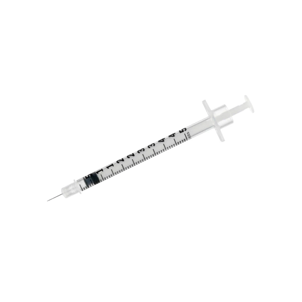 Strzykawka z wtopioną igłą. Gumowy tłok z uszczelką z gumy zapewnia płynny ruch, zabezpieczając przed przypadkowym wycofywaniem tłoka.